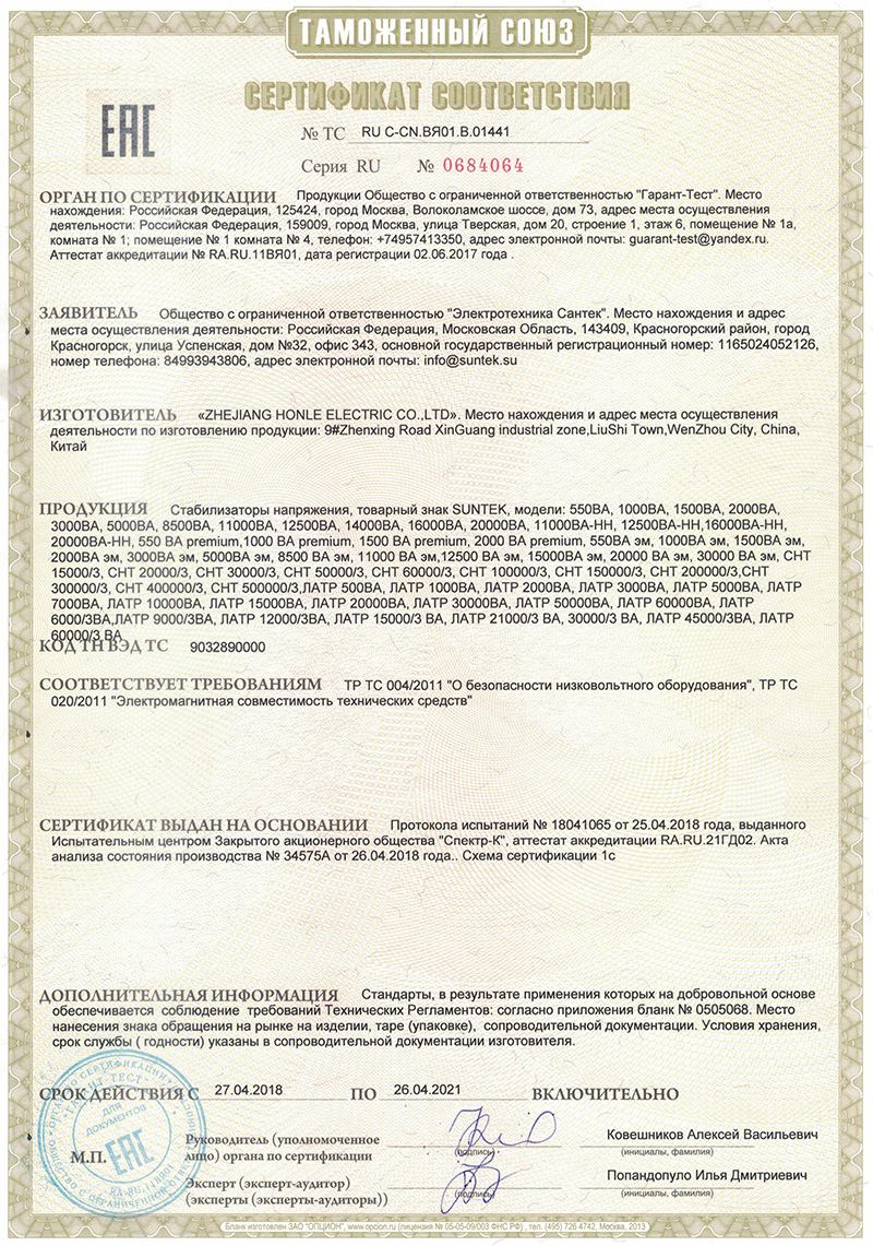 SUNTEK - это российский производитель, стабилизаторы собираются в России и в Китае. На всю продукцию есть Сертификаты соответствия. Производитель уверен в своих стабилизаторах, поэтому дает расширенную гарантию на 3 года. А все потому что в продукции SUNTEK стоят качественные комплектующие следующих промзводителей: